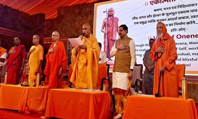 मुख्यमंत्री डॉ. यादव ने ओंकारेश्वर स्थित एकात्म धाम में संबोधित करते हुए कहा कि ओंकार पर्वत पर स्थापित आदि गुरु शंकराचार्य की 108 फीट ऊंची प्रतिमा व आदि गुरु शंकराचार्य की दीक्षा स्थली को प्रदेश सरकार एकात्म धाम के रूप में विकसित कर रही है। उन्होंने एकात्म धाम को चरणबद्ध तरीके से पूर्ण करने के बात कही। उन्होंने कहा कि आदि गुरु शंकराचार्य ने अपने जीवन काल में अनेक महान कार्य किए। उन्होंने कहा कि आदि गुरु शंकराचार्य की चेतना शास्त्र परंपरा से हमारा परिचय कराती है। भारत को शक्ति संपन्न बनने के लिए ज्ञान, आध्यात्म, शास्त्र एवं शस्त्र सभी विधाओं की आवश्यकता है। हमारे संतों एवं संन्यासियों ने धर्म की स्थापना के लिए अपने प्राण न्योछावर किए। शस्त्र के साथ शास्त्र की परंपरा का अद्भुत तालमेल किया है। सरकार ने धार्मिक नगरों में शराब बंदी की शुरुआत की है एवं सरकार दुग्ध उत्पादन को कामधेनु योजना के माध्यम से बढ़ावा दे रही है। सरकार सांस्कृतिक पर्वों एवं त्योहारों को समाज के साथ समारोहपूर्वक मनाएगी। बताया कि सम्पूर्ण प्रदेश में सभी नगरीय निकायों में गीता भवन बनाये जा रहे हैं।