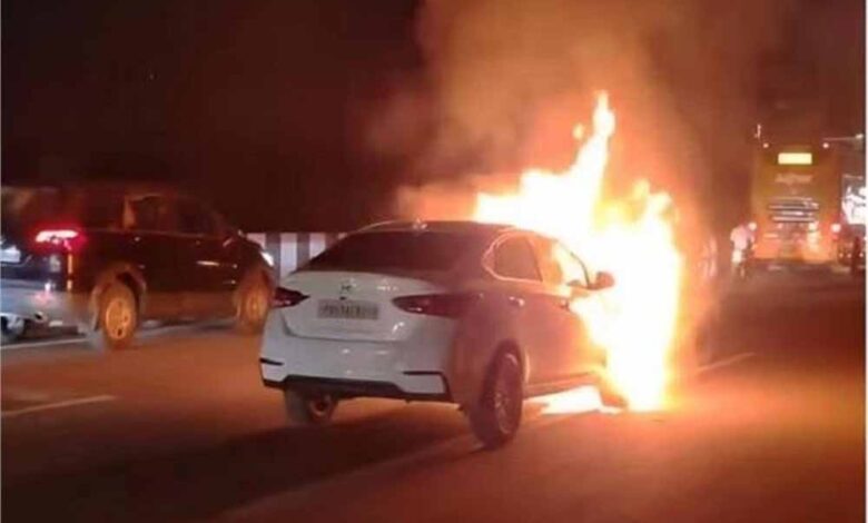 फ्लाईओवर पर चलती कार में लगी आग, देखते ही हर कोई दहशत में आ गया