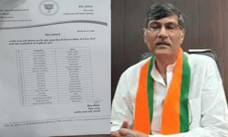 प्रदेशभर में भाजपा की नई जिलास्तरीय टीमें घोषित की जा रही हैं और उसी क्रम में भिवानी जिला कार्यकारिणी का ऐलान भी किया गया है। नई टीम के गठन को पार्टी की संगठनात्मक मजबूती और आगामी चुनावी तैयारियों के लिहाज से अहम माना जा रहा है।