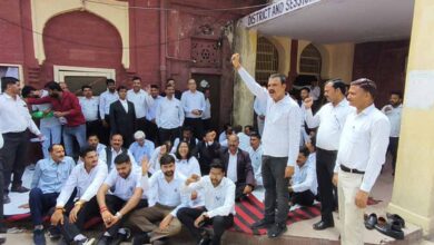 चैंबर्स की मांग को लेकर अधिवक्ताओं ने डीजे कोर्ट के बाहर दिया धरना