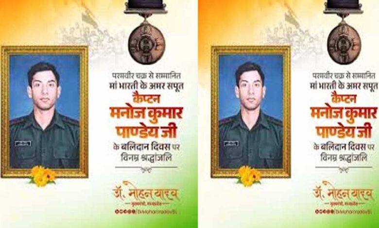 मुख्यमंत्री डॉ. मोहन यादव ने परमवीर चक्र से सम्मानित मां भारती के अमर सपूत कैप्टन मनोज कुमार पाण्डेय के बलिदान दिवस पर उन्हें विनम्र श्रद्धांजलि अर्पित की। मुख्यमंत्री डॉ. यादव ने कहा कि शहीद कैप्टन पाण्डेय ने कारगिल युद्ध में तिरंगे की शान को बनाए रखते हुए मातृभूमि की रक्षा के लिए अपना सर्वस्व न्यौछावर कर दिया था। अदम्य साहस, अचूक रणकौशल के धनी और पराक्रमी शहीद कैप्टन पाण्डेय का जीवन सदैव युवाओं को राष्ट्र भक्ति के लिए प्रेरित करता रहेगा।