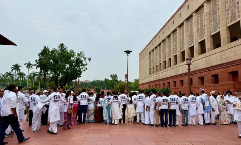 बिहार में जारी चुनाव आयोग के वोटर लिस्ट रिवीजन (SIR) के खिलाफ संसद में विपक्षी सांसदों ने मंगलवार को भी प्रदर्शन किया। इस दौरान प्रियंका गांधी वाड्रा समेत कई कांग्रेस सांसद एक महिला का फोटो और नाम वाला टीशर्ट पहनकर पहुंचे और एसआईआर का विरोध किया। सभी के टीशर्ट के पीछे की तरफ ‘124 नॉट आउट’ लिखा हुआ था। इसके बाद यह टीशर्ट देश भर के लोगों में चर्चा का विषय बना हुआ है।