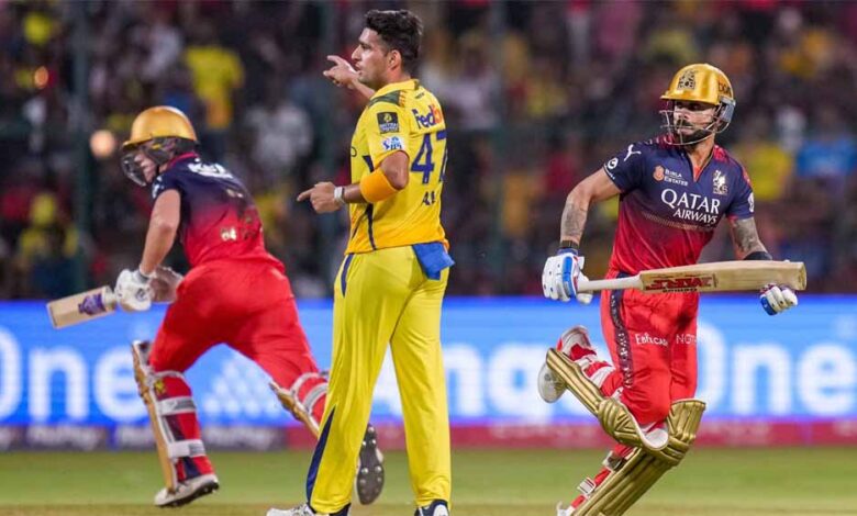 रॉयल चैलेंजर्स बेंगलुरु और चेन्नई सुपर किंग्स के बीच शनिवार को आईपीएल 2025 का 52वां मुकाबला एम चिन्नास्वामी स्टेडियम में खेला जा रहा है। रॉयल चैलेंजर्स बेंगलुरु ने पहले बल्लेबाजी करते हुए 20 ओवर में पांच विकेट खोकर 213 रन बनाए। विराट कोहली ने 62 और जैकब बेथल ने 55 रन बनाए। चेन्नई के लिए पथिराना ने तीन विकेट लिए। बेंगलुरु ने अंतिम दो ओवर में शेफर्ड की बदौलत 54 रन बनाए।