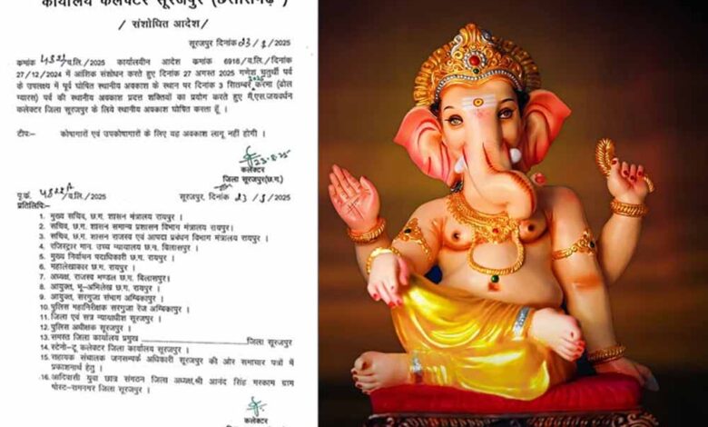 छत्तीसगढ़ के सूरजपुर जिले में कलेक्टर ने गणेश चतुर्थी का अवकाश रद्द कर दिया है. कलेक्टर एस जयवर्धन ने आदेश जारी कर 27 अगस्त यानि गणेश चतुर्थी को पूर्व में घोषित अवकाश को रद्द कर दिया है. साथ ही तीन सितंबर को मनाए जाने वाले करमा जिसे ढोल ग्यारस भी कहा जाता है को स्थानीय अवकाश घोषित किया है.