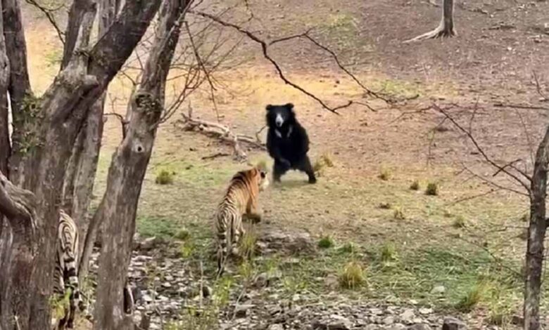रणथंभौर टाइगर रिजर्व में बाघ और भालू आमने-सामने, पर्यटकों ने अपने कैमरों में कैद