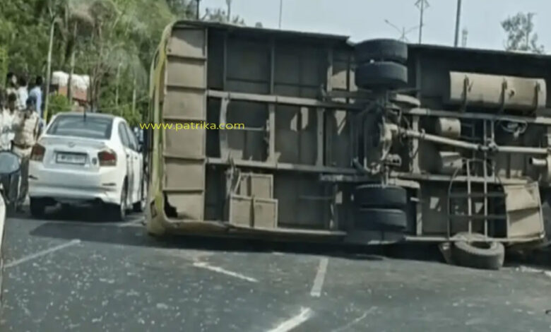 आज दोपहर में नर्मदापुरम रोड पर तेज रफ्तार बस पलटी , जाम लगा
