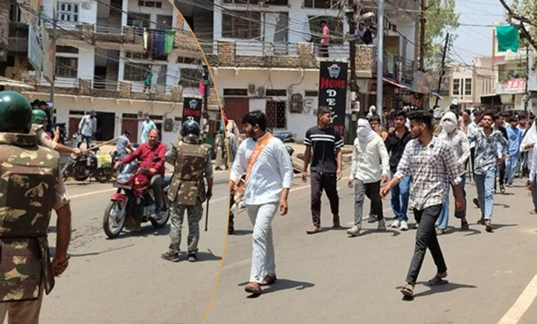 गुना में हनुमान जन्मोत्सव के दिन शोभायात्रा पर हुए हमले के विरोध में विश्व हिंदू परिषद और बजरंग दल ने शहर में प्रदर्शन किया